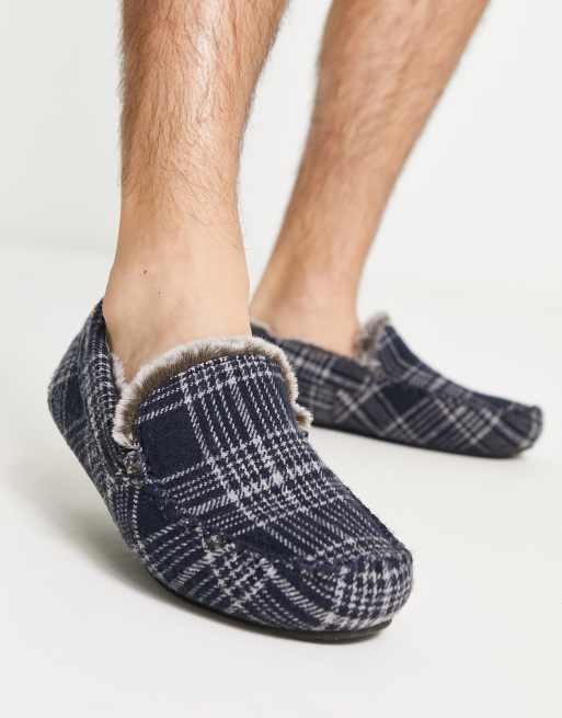 ASOS DESIGN moccasin slippers in navy check