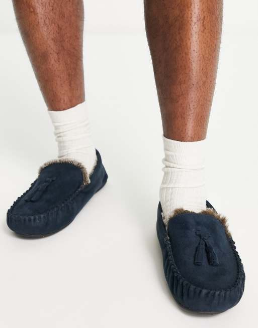 ASOS DESIGN moccasin slippers in navy with faux fur lining