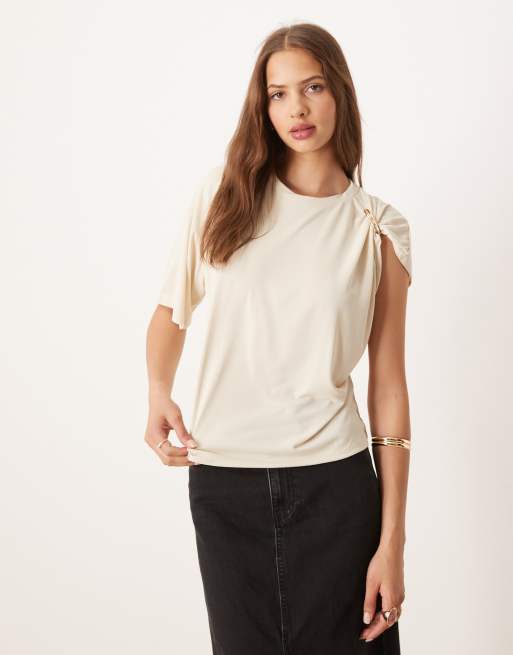 ASOS DESIGN modal drapey tee with hardware shoulder detail tee in cream