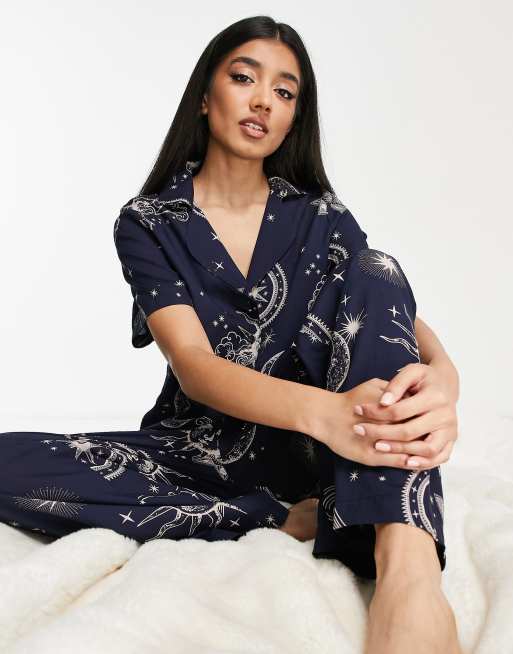 ASOS DESIGN modal horoscope shirt & trouser pyjama set in navy
