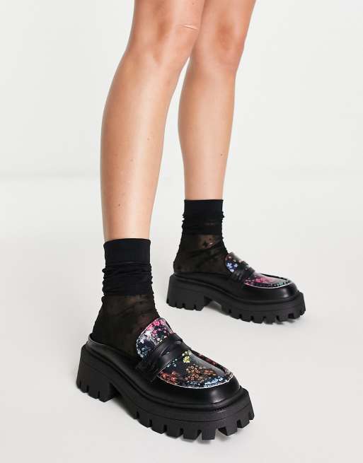 ASOS DESIGN Moment chunky loafer flat mules in black/floral