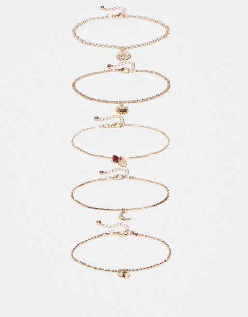 ASOS DESIGN multi-pack bracelets with fine chains and charm drop details in gold tone