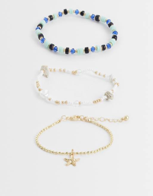 ASOS DESIGN multi-pack of beaded braceletes in blue and gold tone