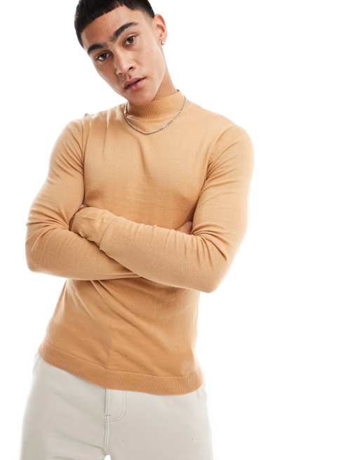 ASOS DESIGN muscle fit knitted essential turtle neck jumper in tan