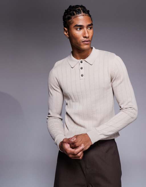 ASOS DESIGN muscle fit long sleeve knitted rib polo in stone