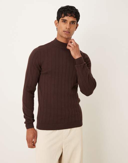 ASOS DESIGN muscle fit long sleeve knitted rib turtle neck t-shirt in brown