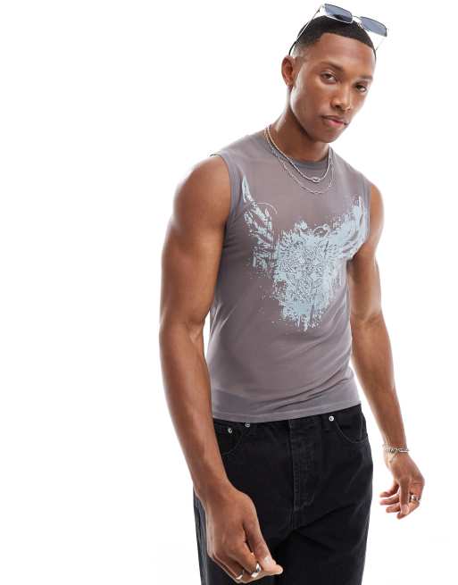 ASOS DESIGN muscle fit vest in grey power mesh with grunge print