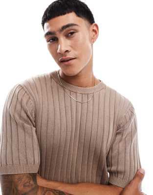 ASOS DESIGN muscle fit washed knitted t-shirt in brown rib