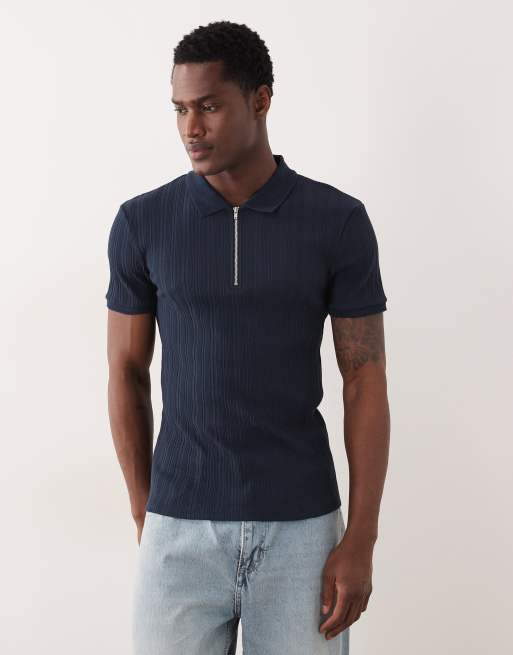 ASOS DESIGN muscle fit zip polo in navy rib