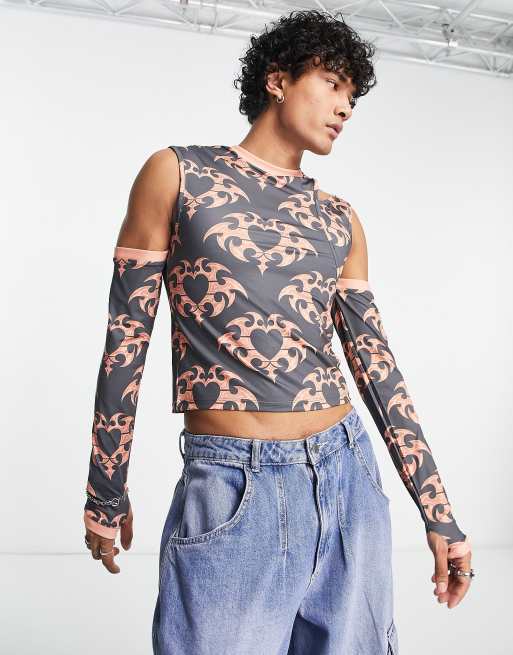 ASOS DESIGN muscle long sleeve t-shirt with cut outs in all over print
