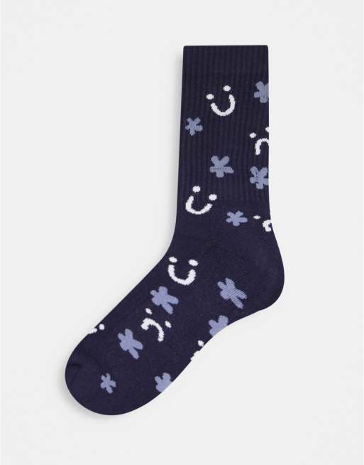 ASOS DESIGN navy sports socks with floral and happy face design