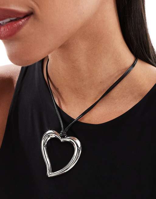 ASOS DESIGN necklace with cord detail and oversized heart in silver tone