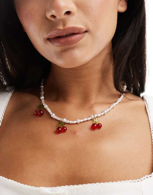 ASOS DESIGN necklace with faux freshwater pearl and triple red cherry design