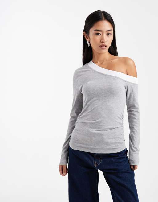 ASOS DESIGN off shoulder double layer long sleeve top in grey and white