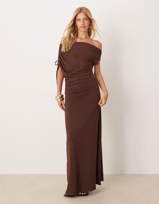 ASOS DESIGN off shoulder drawstring maxi dress in brown