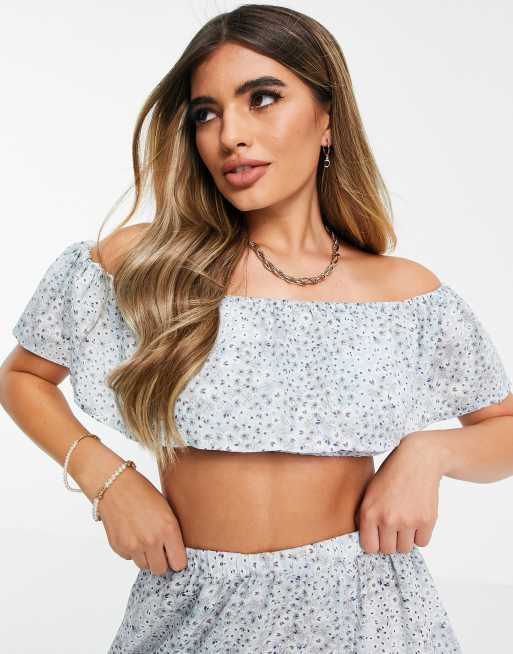 ASOS DESIGN off shoulder floaty beach crop top co ord in ditsy floral print
