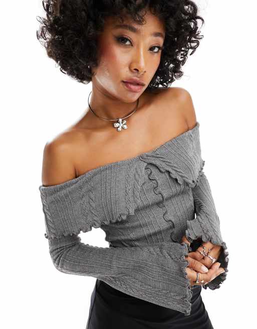 ASOS DESIGN off shoulder long sleeve top in grey cable knit