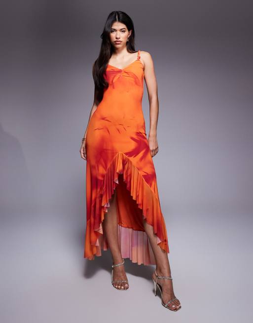 ASOS DESIGN off shoulder ruffle hem mesh maxi dress in orange abstract print