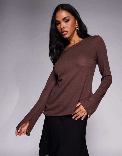 ASOS DESIGN off shoulder sheer knit-look asymmetric top in chocolate