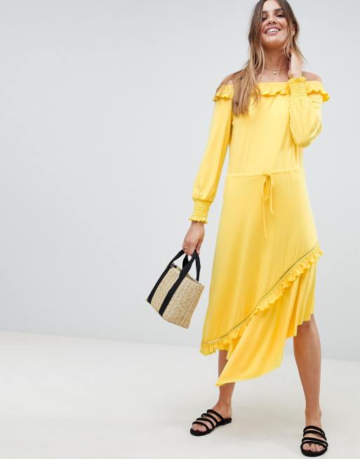 ASOS DESIGN Off Shoulder Shirred Cuff Midi Tea Dress