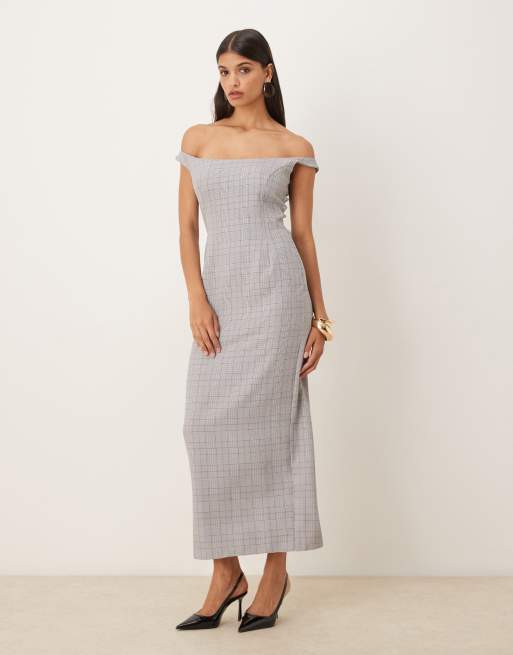 ASOS DESIGN off shoulder tailored pencil midi dress in stone check