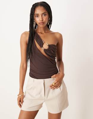 ASOS DESIGN one shoulder gold detail mesh bodysuit in chocolate