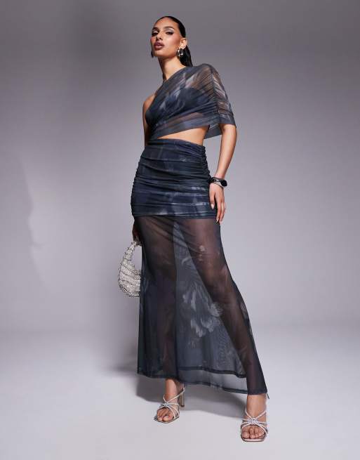 ASOS DESIGN one shoulder maxi dress with ruched bodice and sheer skirt in blurred print
