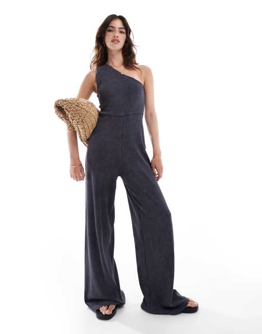 ASOS DESIGN one shoulder ribbed jumpsuit in washed charcoal