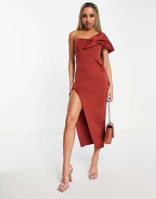 ASOS DESIGN one shoulder seamed bust midi dress with high leg split rust
