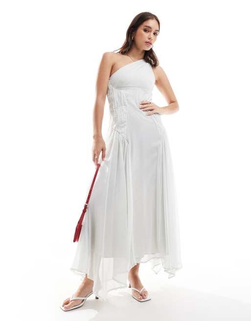 ASOS DESIGN one shoulder side ruched side panel midi dress in pale grey