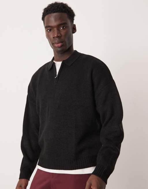ASOS DESIGN oversized boxy fit knitted polo jumper with quarter zip in black