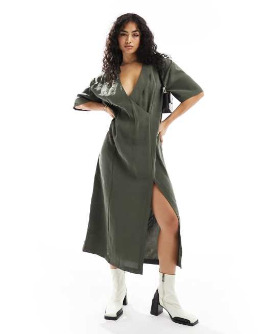 ASOS DESIGN oversized boxy midi dress with wrap collar detail- in dark khaki