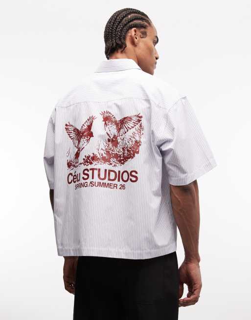 ASOS DESIGN oversized boxy striped shirt with back print in blue