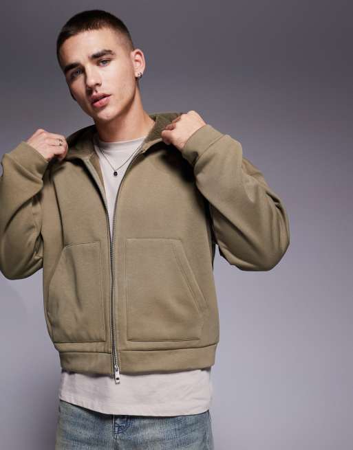 ASOS DESIGN oversized dropped shoulder cropped zip through hoodie with borg lining in khaki