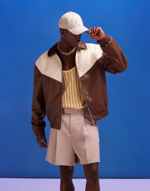 ASOS DESIGN oversized faux leather bomber jacket with cut and sew detail in brown