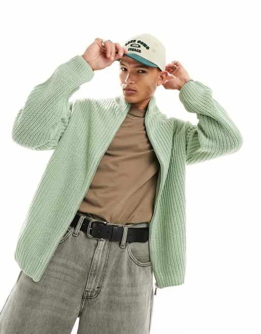 ASOS DESIGN oversized fisherman rib zip through jumper in sage green