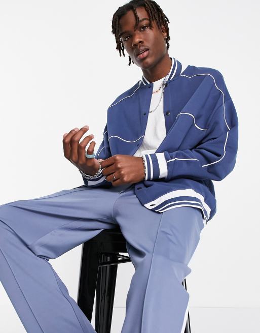 ASOS DESIGN oversized jersey bomber jacket in navy with piping