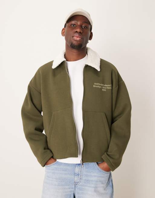ASOS DESIGN oversized jersey coach jacket with borg collar and chest print in khaki