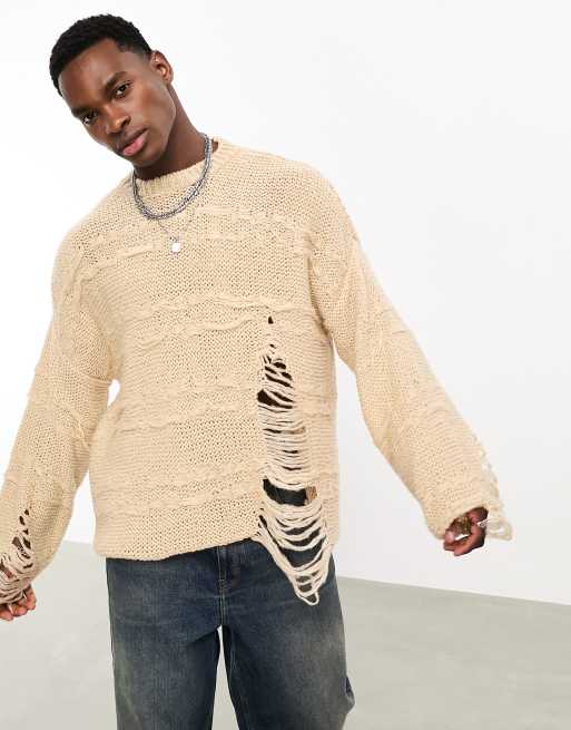 ASOS DESIGN oversized knitted distressed jumper in stone