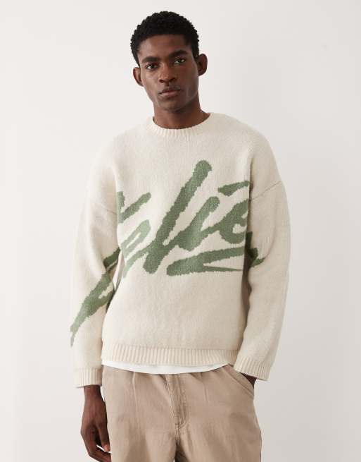 ASOS DESIGN oversized knitted jumper with 'atelier' graphic in ecru and sage