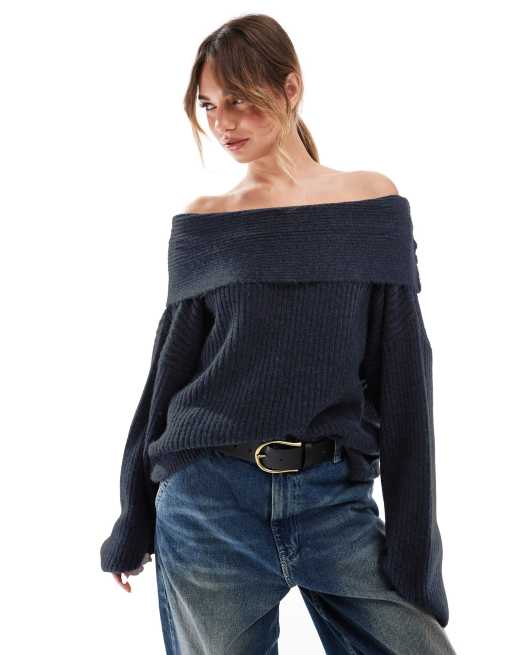 ASOS DESIGN oversized knitted off shoulder jumper in navy