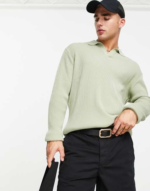 ASOS DESIGN oversized lightweight rib jumper with notch neck in sage green