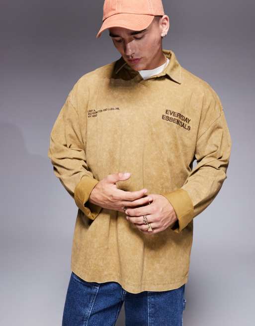 ASOS DESIGN oversized long sleeve polo in heavyweight 220gsm washed khaki with chest embroidery