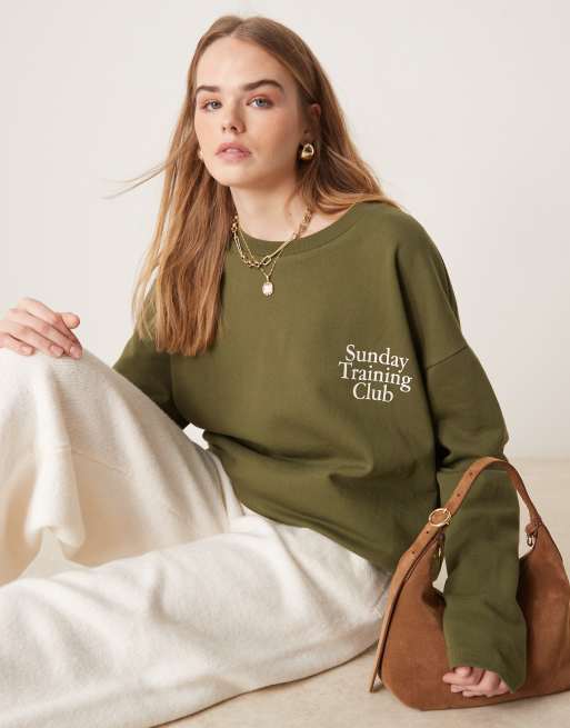 ASOS DESIGN oversized long sleeve top with sunday training club puff print in olive
