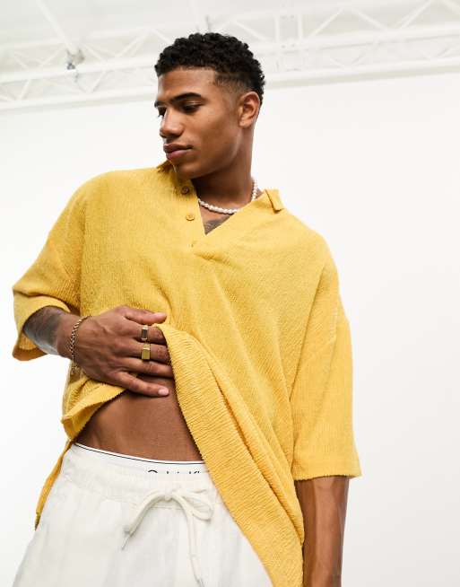 ASOS DESIGN oversized polo shirt in mustard texture with deep v revere collar