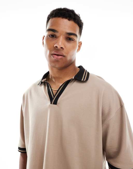 ASOS DESIGN oversized polo with contrast collar and hem detail in stone pique