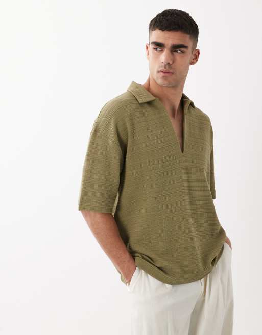 ASOS DESIGN oversized polo with open neck in khaki texture.