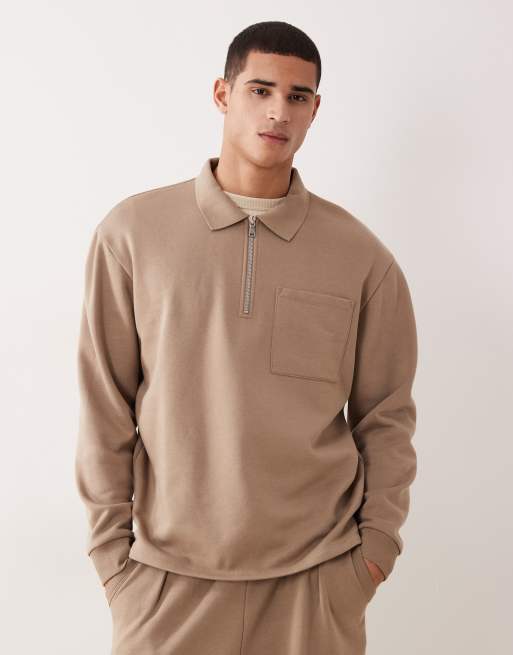 ASOS DESIGN oversized quarter zip sweatshirt with ribbed collar in beige
