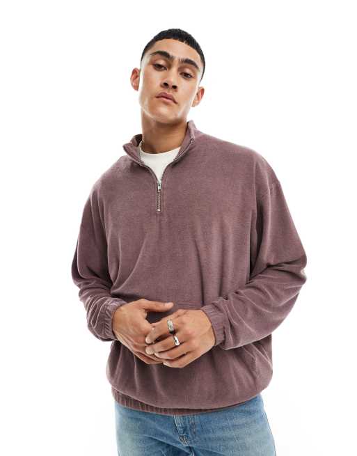 ASOS DESIGN oversized quarter zip towelling sweatshirt in washed brown mauve