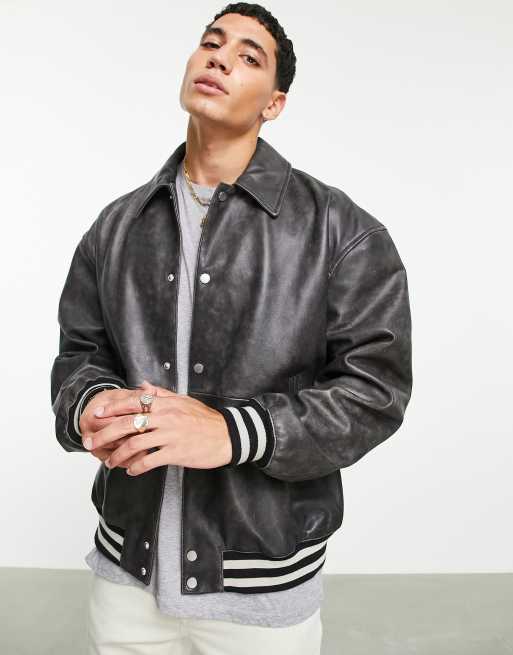 ASOS DESIGN oversized real leather varsity bomber jacket in black